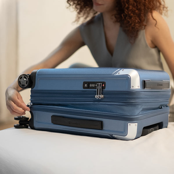 Integrated lock allows TSA authorities to safely unlock and lock suitcase for inspection when needed. Default lock code is 0-0-0 to open.